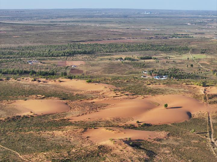 5月30日,在阿门其日格,库布其沙漠边缘的沙丘被树林阻挡(无人机照片)。新华社记者 连振 摄