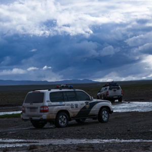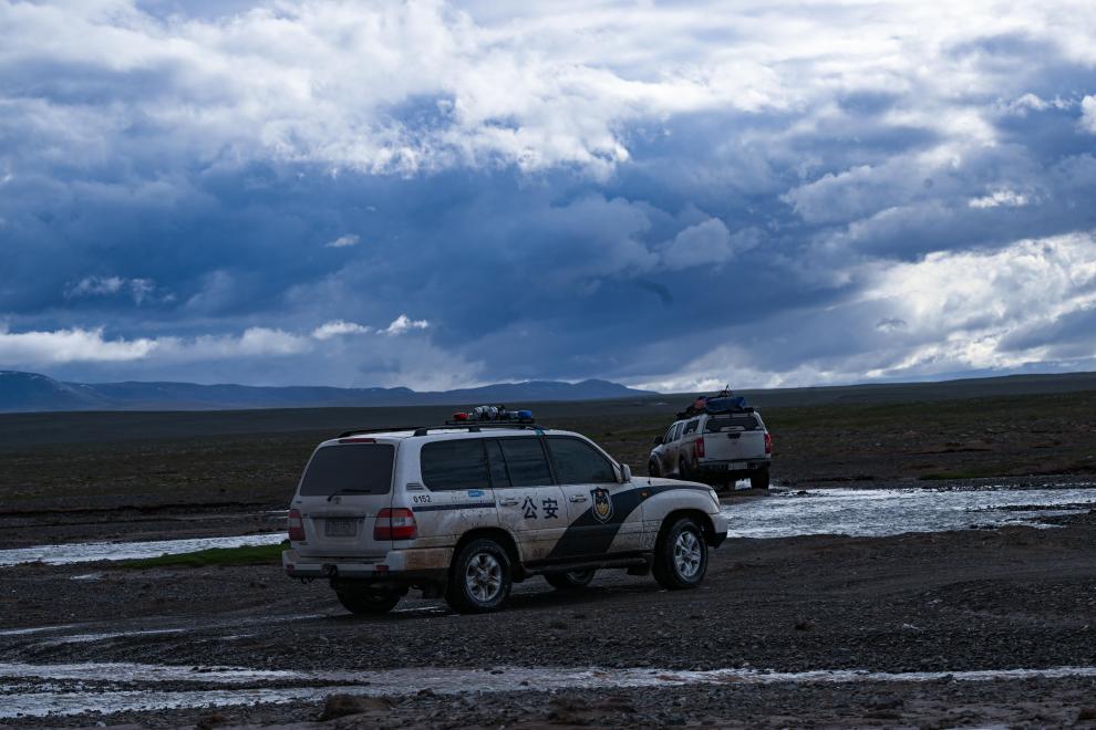 可可西里的夏季可谓一天见四季,十里不同天。初入无人区还是晴空万里,走了十几公里后车队就被乌云笼罩,分不清是雨点还是冰雹,噼里啪啦地砸向车窗。
