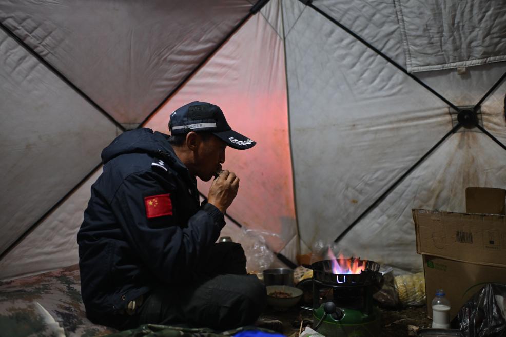 7月8日,在可可西里卓乃湖区域,巡山队员尼玛扎西在帐篷里吃晚饭。新华社记者 张龙 摄