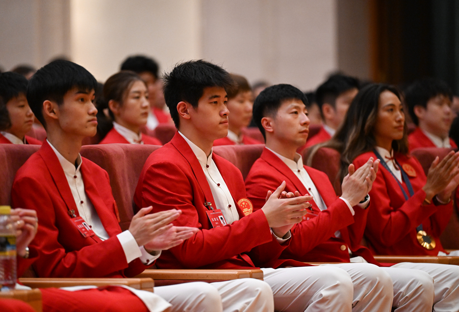 8月20日,射击运动员盛李豪、游泳运动员潘展乐、乒乓球运动员马龙、网球运动员郑钦文(前排,从左至右)在总结大会上。新华社记者 宋彦桦 摄