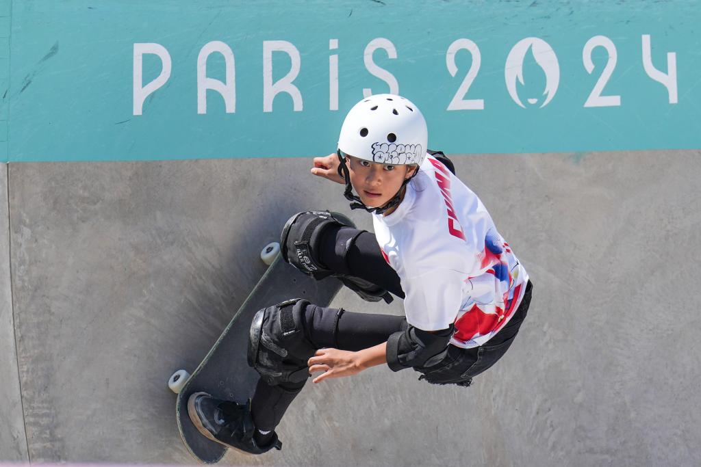 ↑8月6日,中国选手郑好好在巴黎奥运会滑板女子碗池预赛中。新华社记者 杜宇 摄