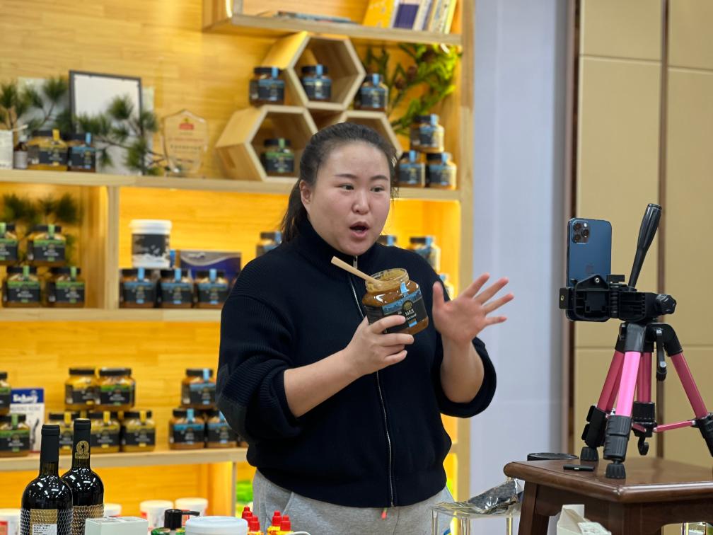 在绥芬河市,一名主播在直播带货。新华社记者刘赫垚 摄