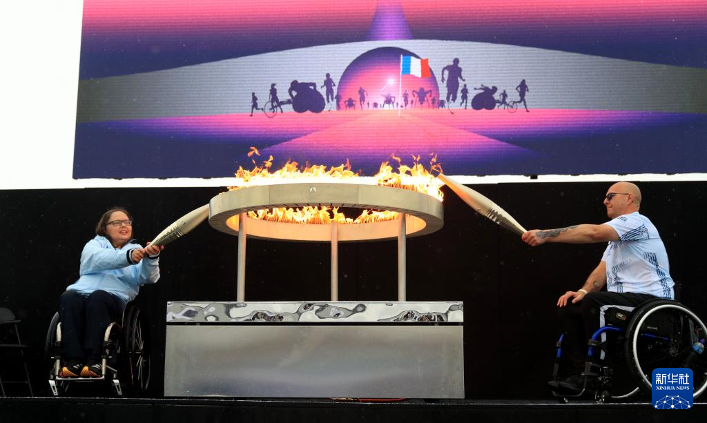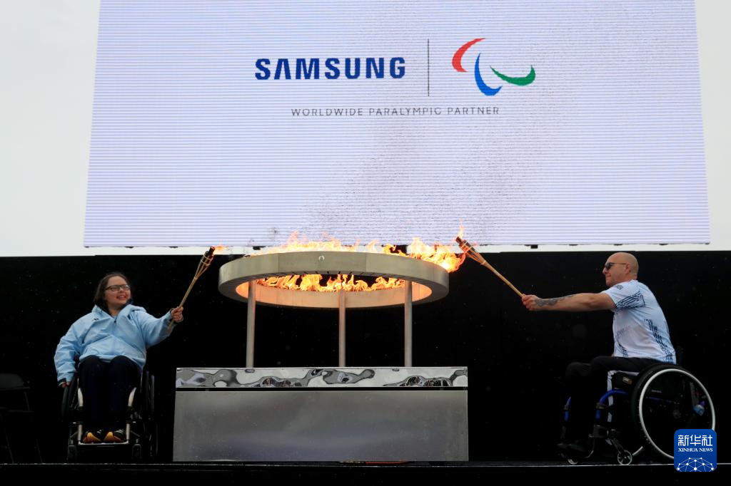 8月24日,英国赛艇运动员海伦妮·雷恩斯福德(左)和英国轮椅冰壶运动员格雷戈尔·伊万点燃巴黎残奥会圣火盆。