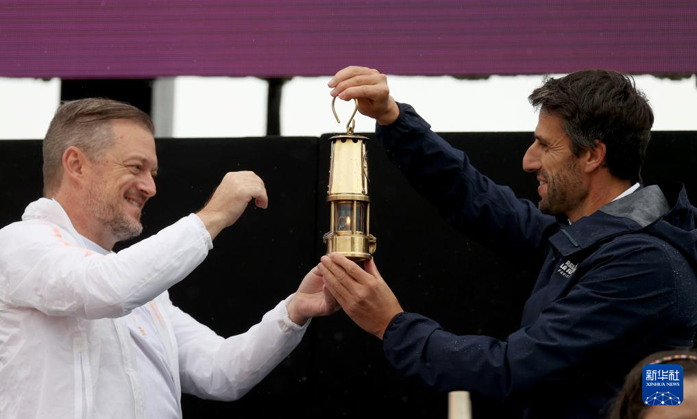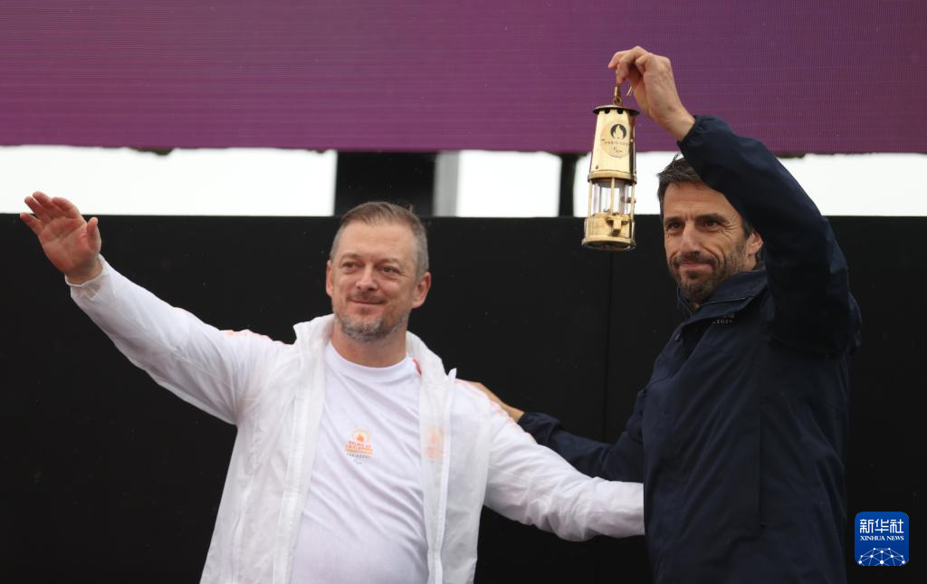 8月24日,国际残奥委会主席安德鲁·帕森斯(左)将火种灯交给巴黎奥组委主席托尼·埃斯坦盖。