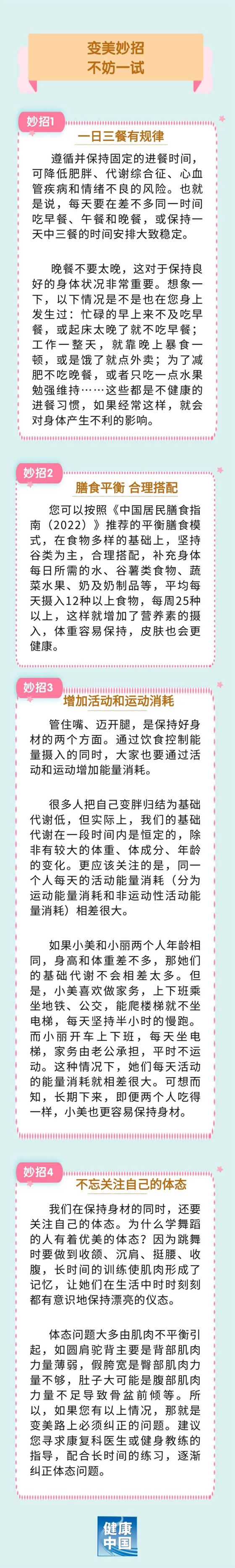 爱美之心,人皆有之。现如今,我们追求的美更加多元,不只是外在容貌和形体上的美,内在思想、品德、理想、修养、认知散发的美,也是大家追求的目标。内在的美需要通过一定的人生历练逐渐获得,外在美则只需要我们保持健康的生活方式。即便没有精致的五官和绝佳的身材比例,紧致的皮肤、光泽的头发、正常的体重、良好的体态,也会让人散发健康之美。