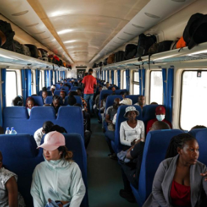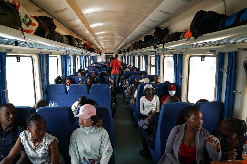 2023年9月,在肯尼亚蒙内铁路内罗毕站,乘客坐在即将开往蒙巴萨的客运列车车厢内。新华社记者 韩旭 摄