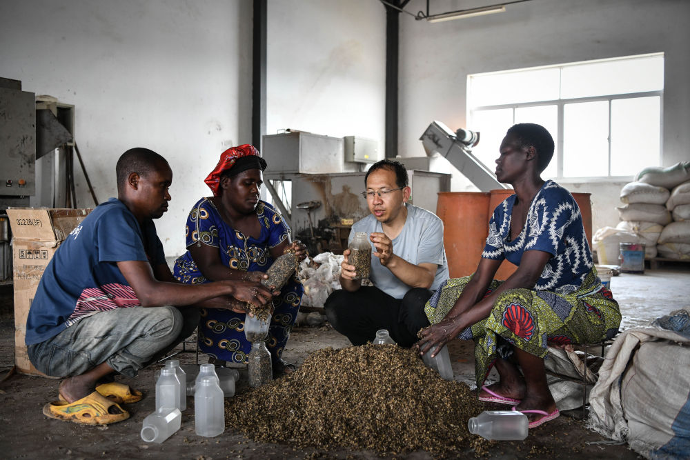 ↑中国菌草专家陈晓斌(右二)在卢旺达南方省胡耶区的中国援卢农业技术示范中心与当地农民一起制作菌种培养料。