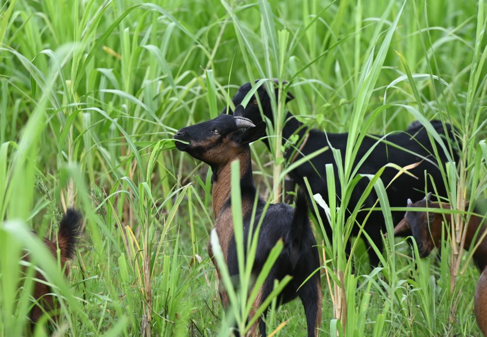 ↑以菌草为饲料养殖的富泉羊在福建省永泰县清凉镇北斗村的“珍农菌草富泉羊循环产业示范基地”里吃菌草。