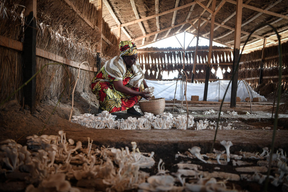 ↑法蒂玛在位于中非共和国达马拉的菇棚内收获菌菇。
