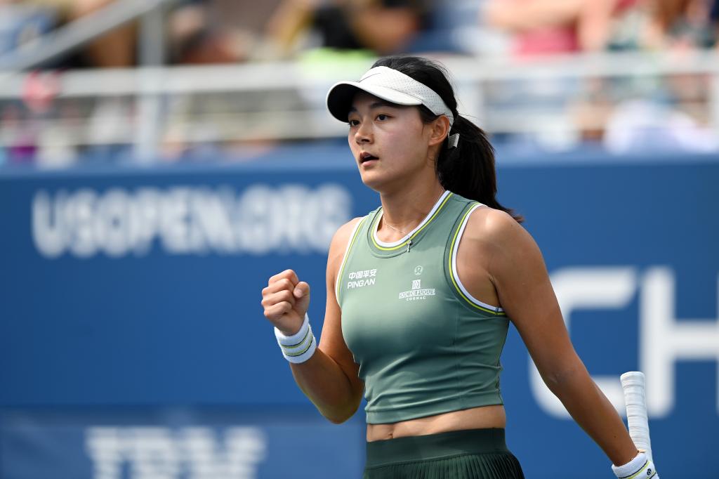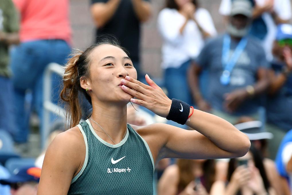 8月30日,郑钦文在比赛后向观众飞吻。新华社记者 李睿 摄