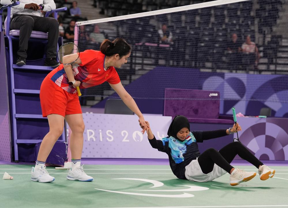 9月2日,羽毛球女子单打SL3级决赛,肖祖贤战胜印度尼西亚选手沙库尔奥夺冠。镜头定格下沙库尔奥比赛中摔倒在地,肖祖贤伸手将她搀扶起的瞬间,成为本届残奥会的暖心一刻。