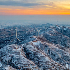 这是在山西省运城市万荣县境内拍摄的风力发电机组(2024年1月24日摄,无人机照片)。 新华社发(闫鑫 摄)