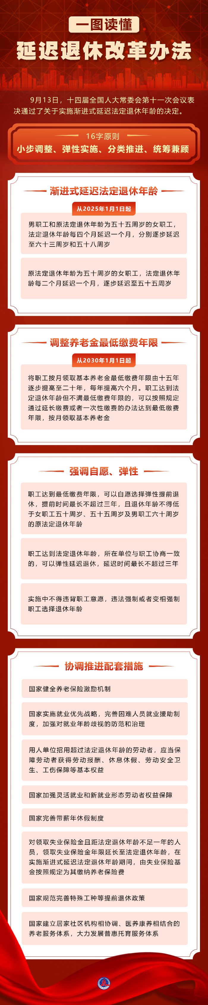 9月13日,全国人大常委会会议表决通过了关于实施渐进式延迟法定退休年龄的决定。根据决定,从2025年1月1日起,我国将用15年时间,逐步将男职工的法定退休年龄从原60周岁延迟到63周岁,将女职工的法定退休年龄从原50周岁、55周岁,分别延迟到55周岁、58周岁。