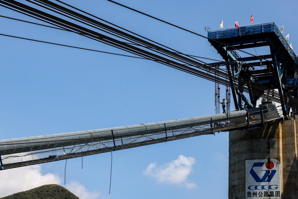 9月4日,建筑工人在花江峡谷大桥的猫道上施工。新华社记者 欧东衢 摄