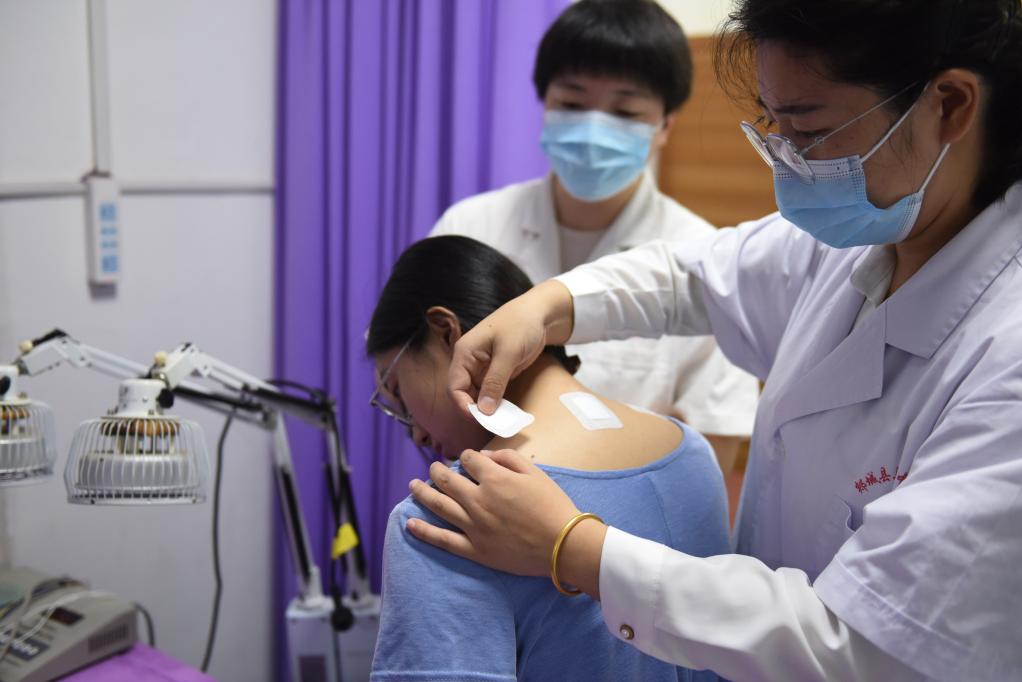 7月15日,山东省临沂市郯城县马头中心卫生院国医堂医护人员在给市民贴“三伏贴”。新华社发(房德华摄)