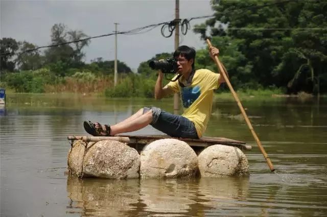新华社记者黄孝邦在抗洪报道中一边划简易木筏一边拍摄。