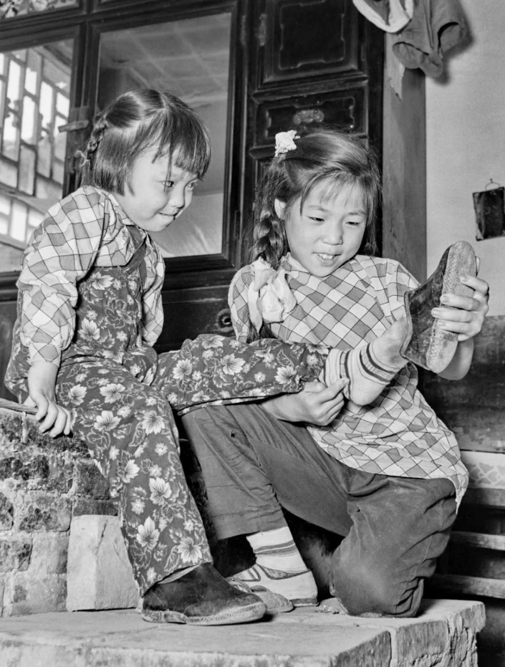 1957年,在山西太谷县一家农户里,姐姐为妹妹穿上新买的胶鞋。新华社记者 张瑞华 摄