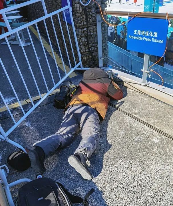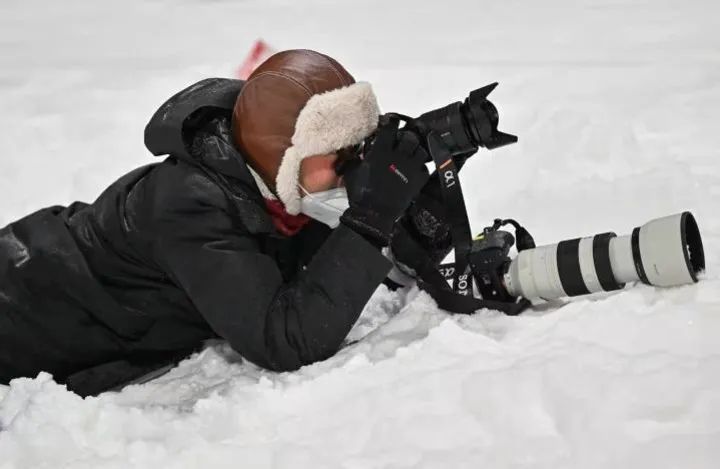 北京冬奥会期间,在张家口赛区,新华社记者江宏景趴在雪地上拍摄比赛。