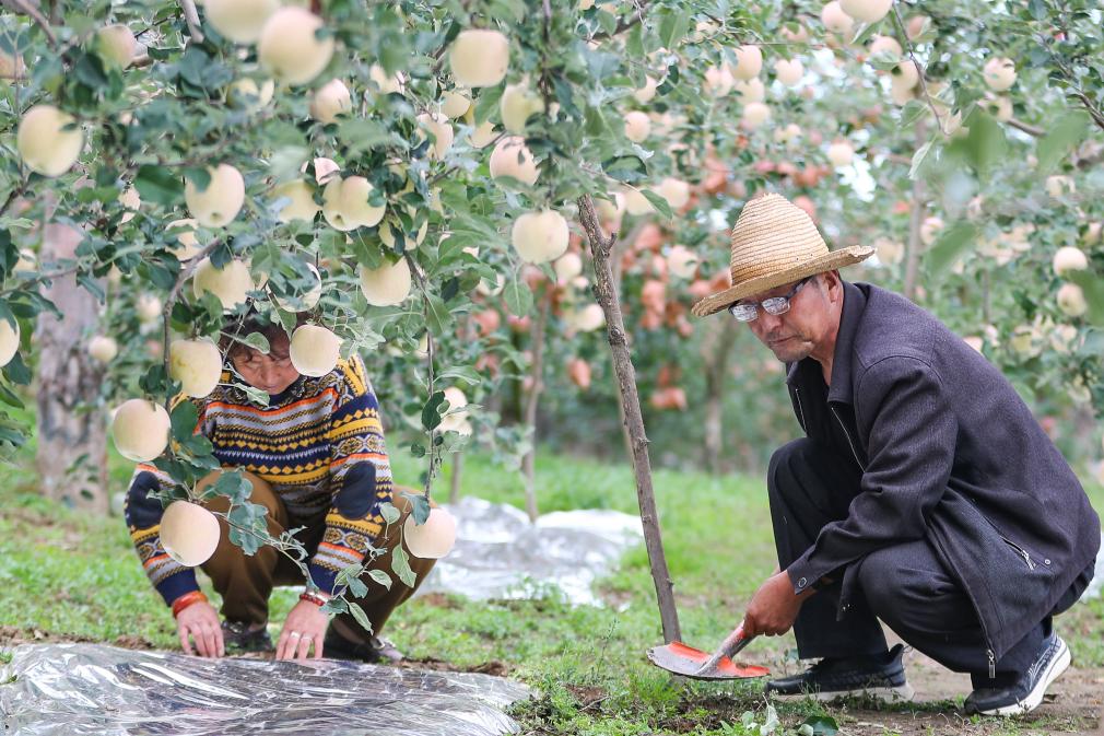 礼县永兴镇龙槐村61岁的果农张加成(右)和妻子在苹果树下铺设反光膜。新华社记者 郎兵兵 摄