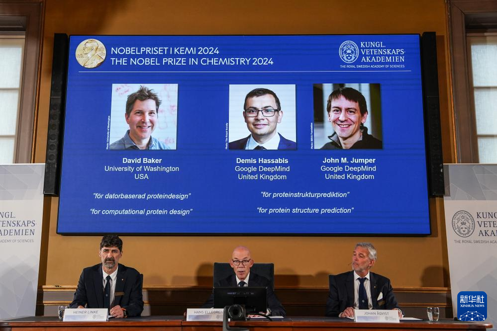 新华社斯德哥尔摩10月9日电(记者郭爽)瑞典皇家科学院9日宣布,将2024年诺贝尔化学奖授予美国华盛顿大学西雅图分校的戴维·贝克,以及谷歌旗下“深层思维”公司的德米斯·哈萨比斯和约翰·江珀,以表彰他们破解了蛋白质神奇结构的密码。