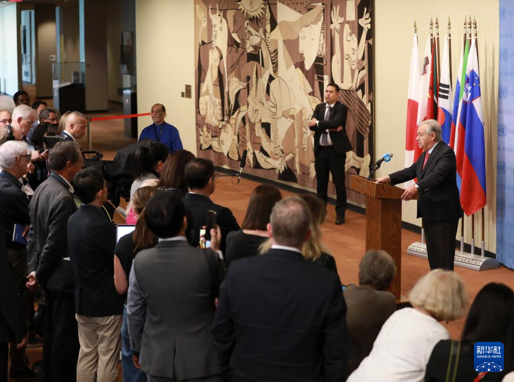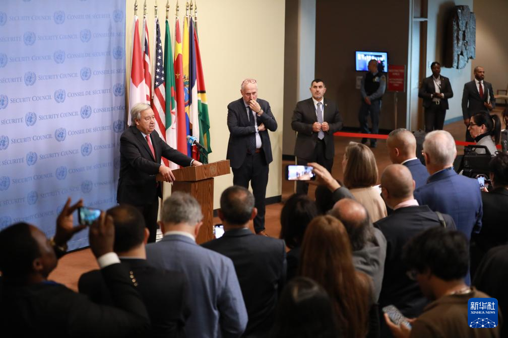 10月8日,在位于纽约的联合国总部,联合国秘书长古特雷斯(上右一)对媒体讲话。新华社记者 谢锷 摄