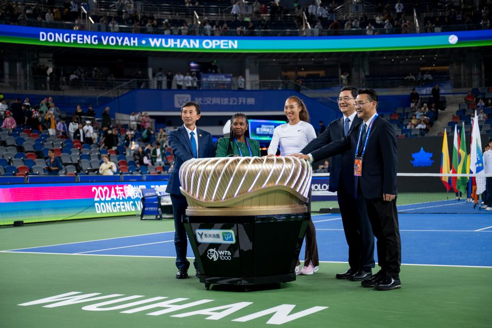 10月7日,郑钦文(中)在2024年WTA武汉网球公开赛开幕仪式上。新华社记者 伍志尊 摄