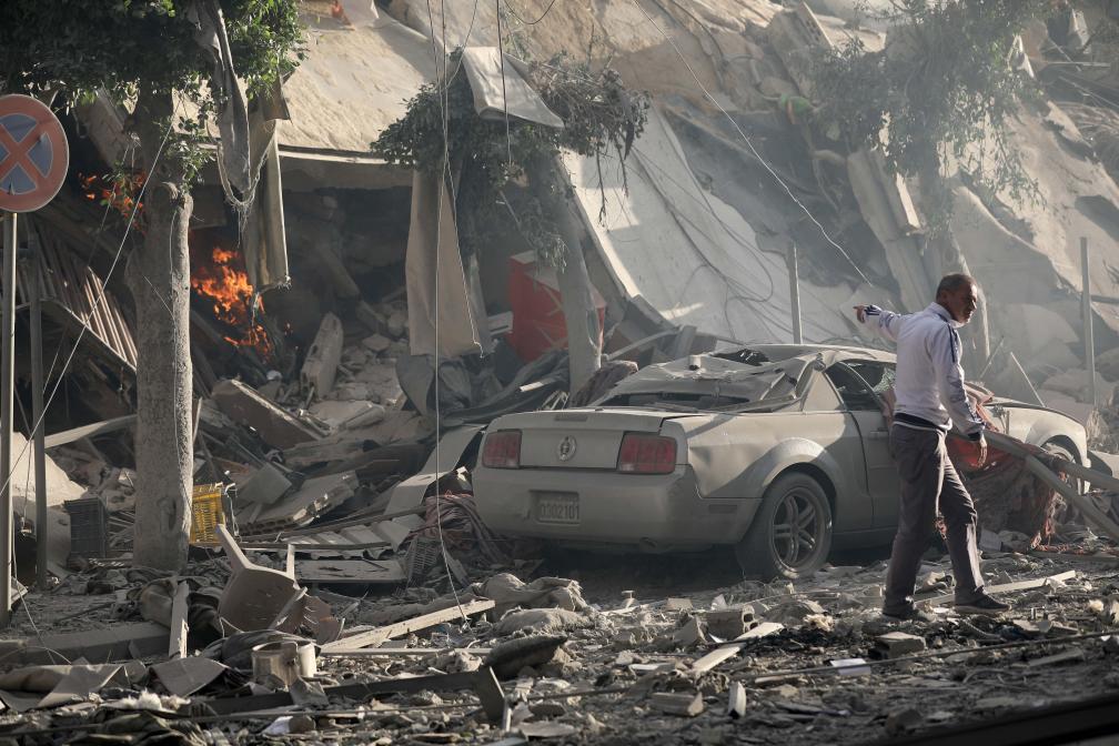 10月3日,在黎巴嫩首都贝鲁特,男子指向空袭过后废墟中的余火。新华社发(比拉尔·贾维希摄)