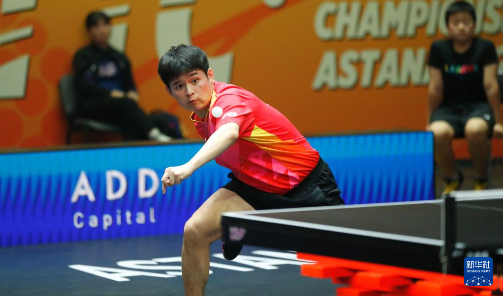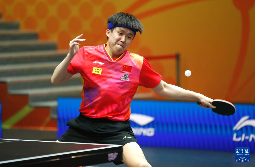 10月10日,中国队选手王楚钦在比赛中回球。最终,他3比2战胜中国台北队选手林昀儒。新华社发(奥斯帕诺夫摄)