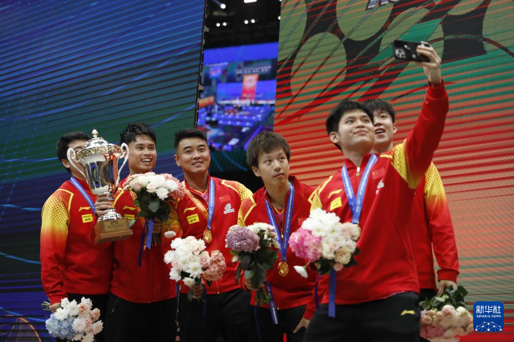 10月10日,中国队选手和教练梁靖崑、周启豪、林诗栋、王皓、林高远、王楚钦(从左至右)在颁奖仪式上。新华社发(奥斯帕诺夫摄)