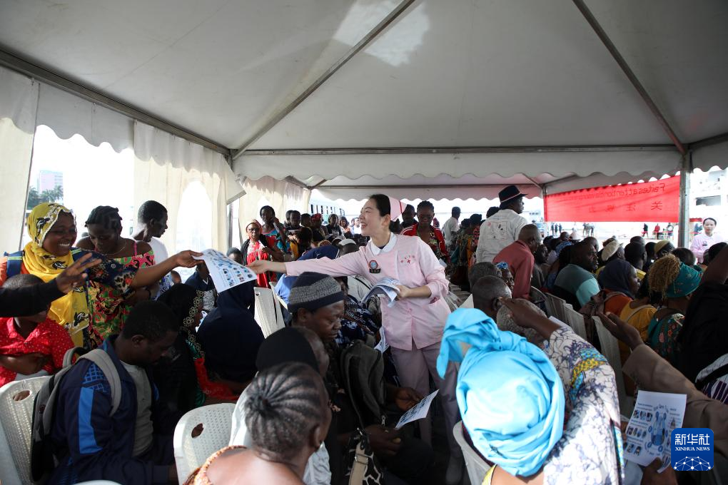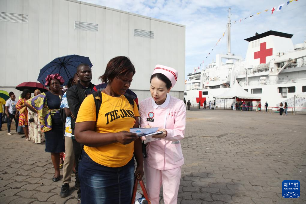 10月10日,中国海军“和平方舟”号医院船在喀麦隆开展活动,医务人员发放宣传手册。新华社发(刘志磊摄)