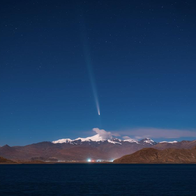 2024年10月15日在西藏山南羊卓雍措拍摄的紫金山-阿特拉斯彗星与雪山“同框”。(戴建峰摄)