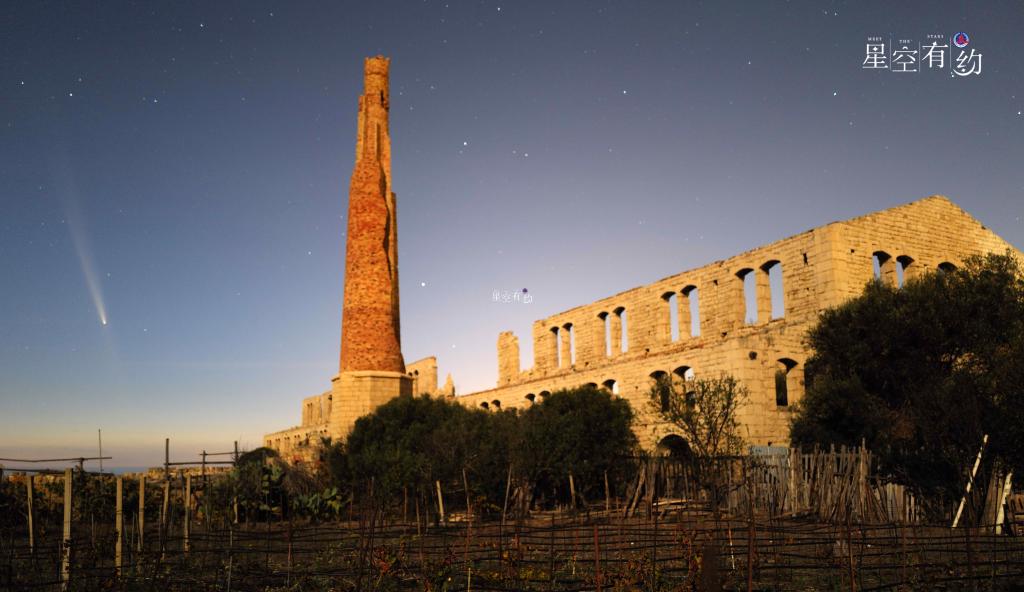 2024年10月14日,在意大利西西里大区拉古萨省,紫金山-阿特拉斯彗星从一处历史遗址的上空划过。新华社发(埃德加多·切鲁托摄)