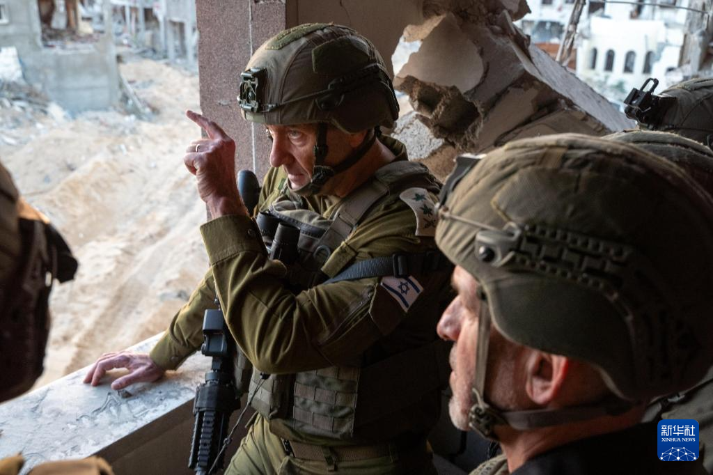10月17日,以色列国防军总参谋长哈莱维(中)在加沙地带辛瓦尔死亡地点附近视察。新华社发(以色列国防军供图)