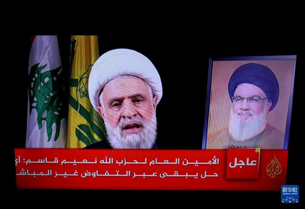 这是10月30日在黎巴嫩首都贝鲁特拍摄的黎巴嫩真主党新任领导人纳伊姆·卡西姆发表讲话的电视画面。新华社发(比拉尔·贾维希摄)