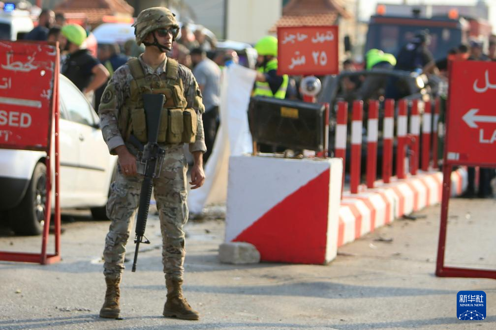 11月7日,在黎巴嫩南部城市西顿,士兵在袭击现场警戒。新华社发(阿里·哈希绍摄)