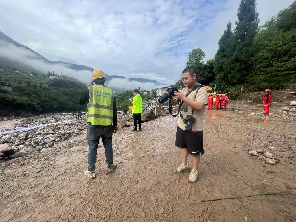 “抵达现场时,我看到几乎一半的县城都被泥石流掩埋,身着绿色武警服、红色消防服的救援人员,拿着铁锨、铁锹在泥泞中奋力营救。我看到很多灾区群众,在雨中撑着伞,站在、蹲在自己家曾经的位置,守护着自己的亲人,而亲人却在脚下厚厚的泥土之中。”
