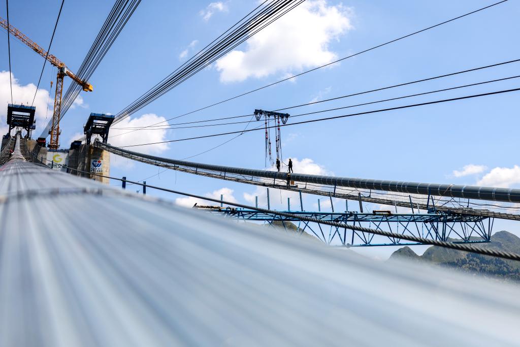 2024年9月4日,建筑工人在花江峡谷大桥的猫道上施工。新华社记者欧东衢摄