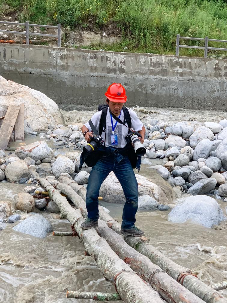 2022年9月8日,在泸定地震灾区,新华社记者沈伯韩跨过河上的简易桥前往共和村采访。