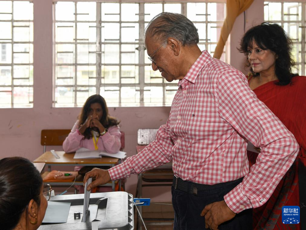 11月10日,前总理保罗·雷蒙·贝朗热(左)在毛里求斯瓦科阿市的一处投票站投票。新华社记者 李亚辉 摄