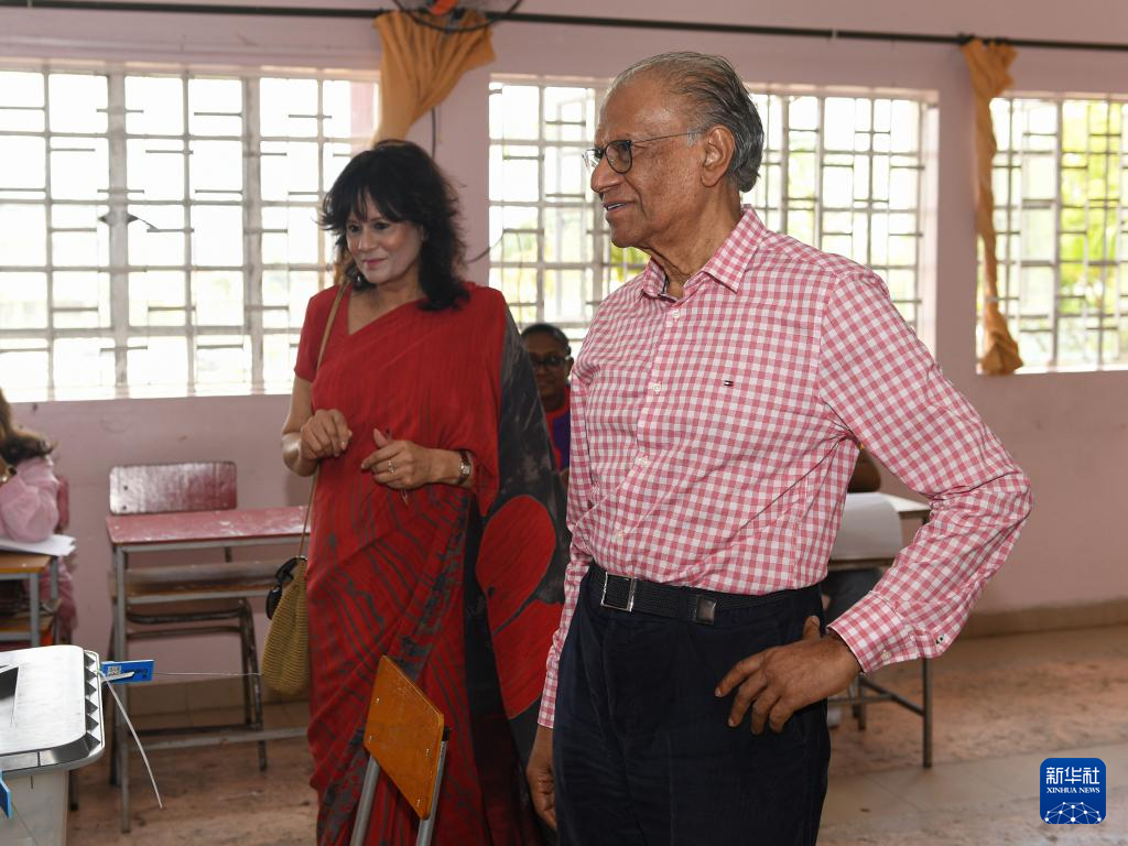 11月10日,前总理纳文钱德拉·拉姆古兰(右)在毛里求斯瓦科阿市的一处投票站参加投票。新华社记者 李亚辉 摄