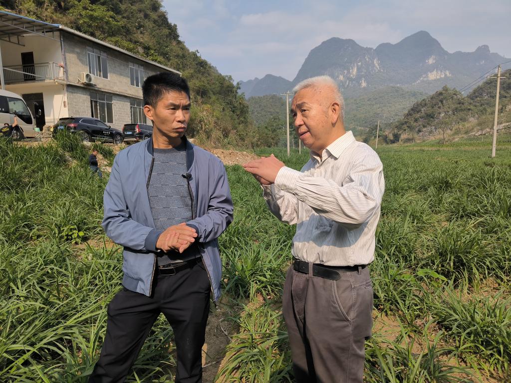 在下南乡波川村环江毛南绿峯种养基地外,田里种满绿油油的牧草。基地负责人谭成语一见到中国科学院的专家团队,就熟络地打起招呼,介绍起基地的新变化。