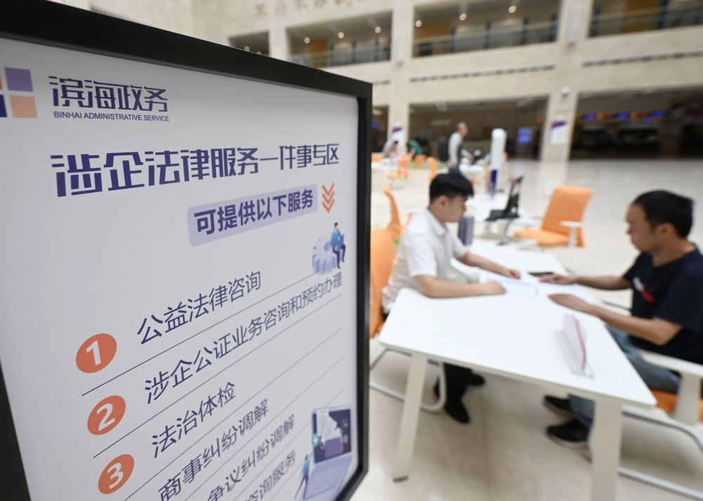 在天津市滨海新区政务服务中心,工作人员在“涉企法律服务一件事”专区为市民提供服务(2024年7月31日摄)。新华社记者 赵子硕 摄