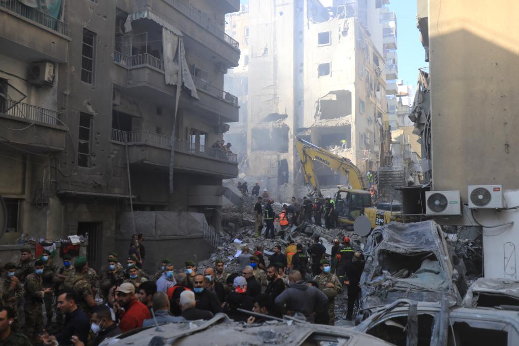 11月23日,在黎巴嫩贝鲁特,人们在遭以军空袭的建筑废墟参与搜救。新华社发