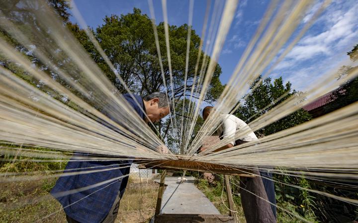 10月27日,在江西省新余市分宜县双林镇下院村,农民使用传统工艺加工制作夏布。新华社发(赵春亮 摄)