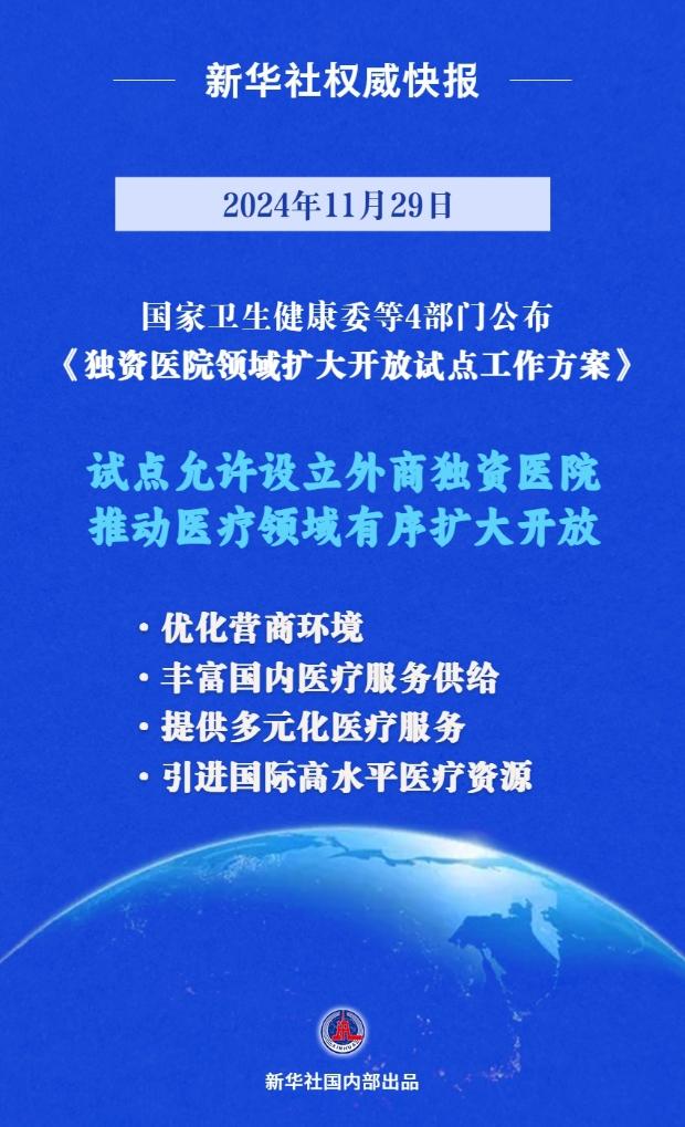11月29日,国家卫生健康委、商务部、国家中医药局、国家疾控局4部门公布《独资医院领域扩大开放试点工作方案》。