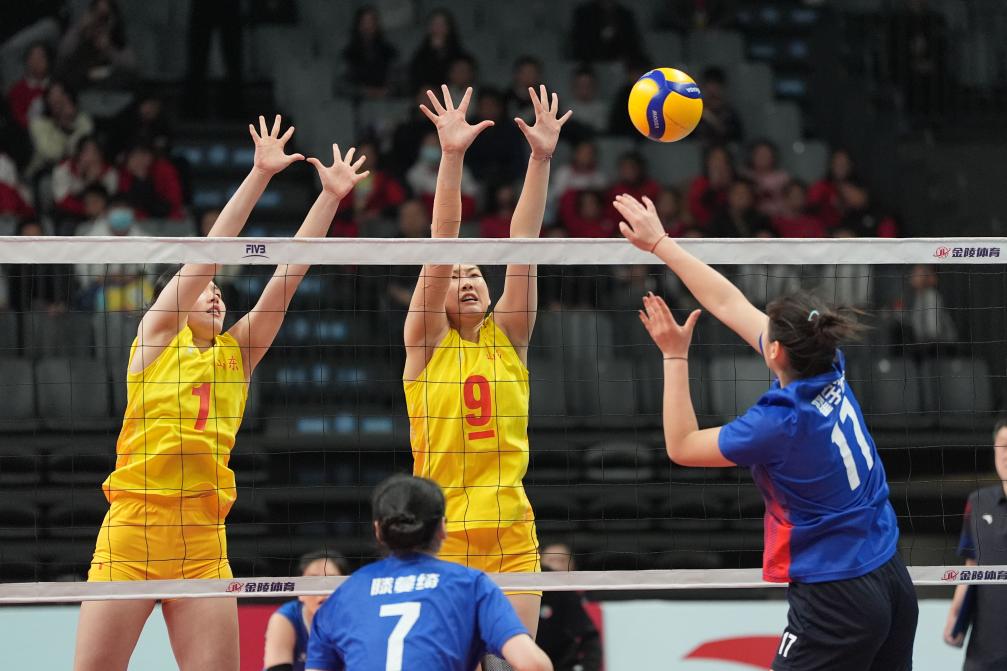 11月27日,山东队球员李晨瑄(中)、李美君(左)在比赛中拦网。当日,在湖南省长沙市贺龙体育馆举行的中华人民共和国第一届青少年三大球运动会排球女子决赛中,山东队3比0战胜江苏队,获得冠军。新华社记者 薛宇舸 摄