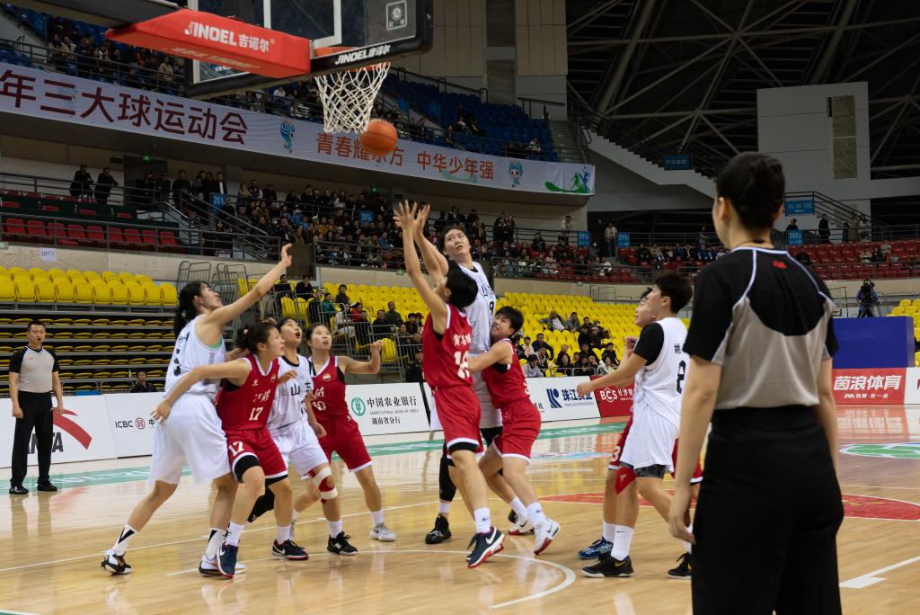 图为11月27日在岳阳市体育中心体育馆进行的女篮半决赛,山东队(白)87比63胜江苏队(红)