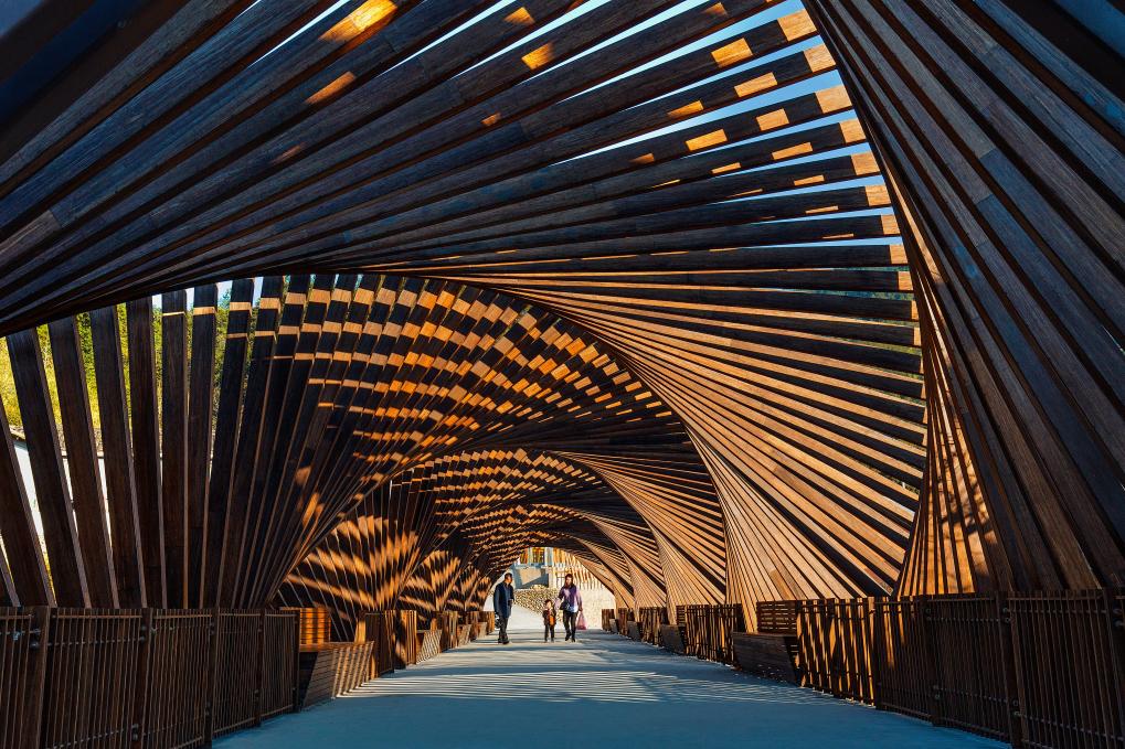 图为溪头村国际竹建筑村落16个建筑单体之一“时光隧道桥”。新华社发