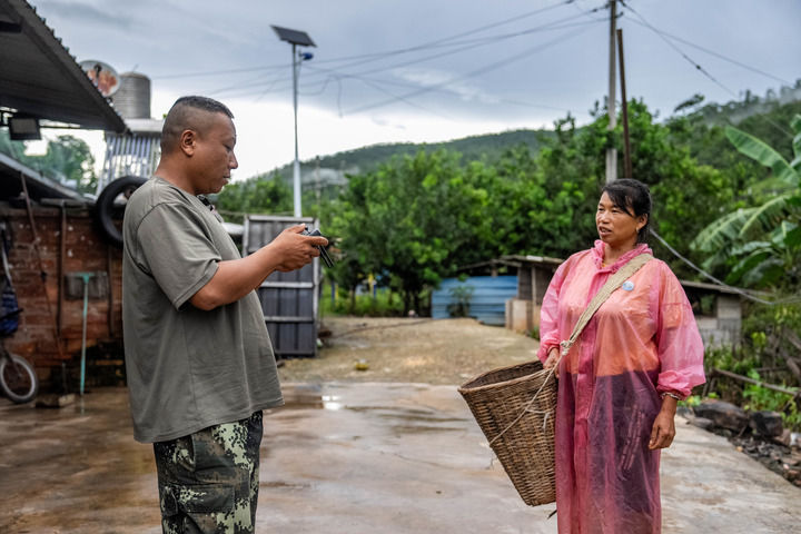 2024年8月8日傍晚,亚洲象监测员彭金福使用无人机监测“短鼻家族”和“然然家族”象群时提醒出行的村民注意安全。