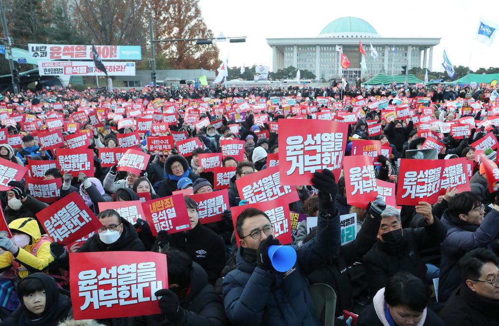 12月7日,在位于韩国首尔的国会附近,韩国民众集会要求弹劾总统尹锡悦。新华社记者姚琪琳摄